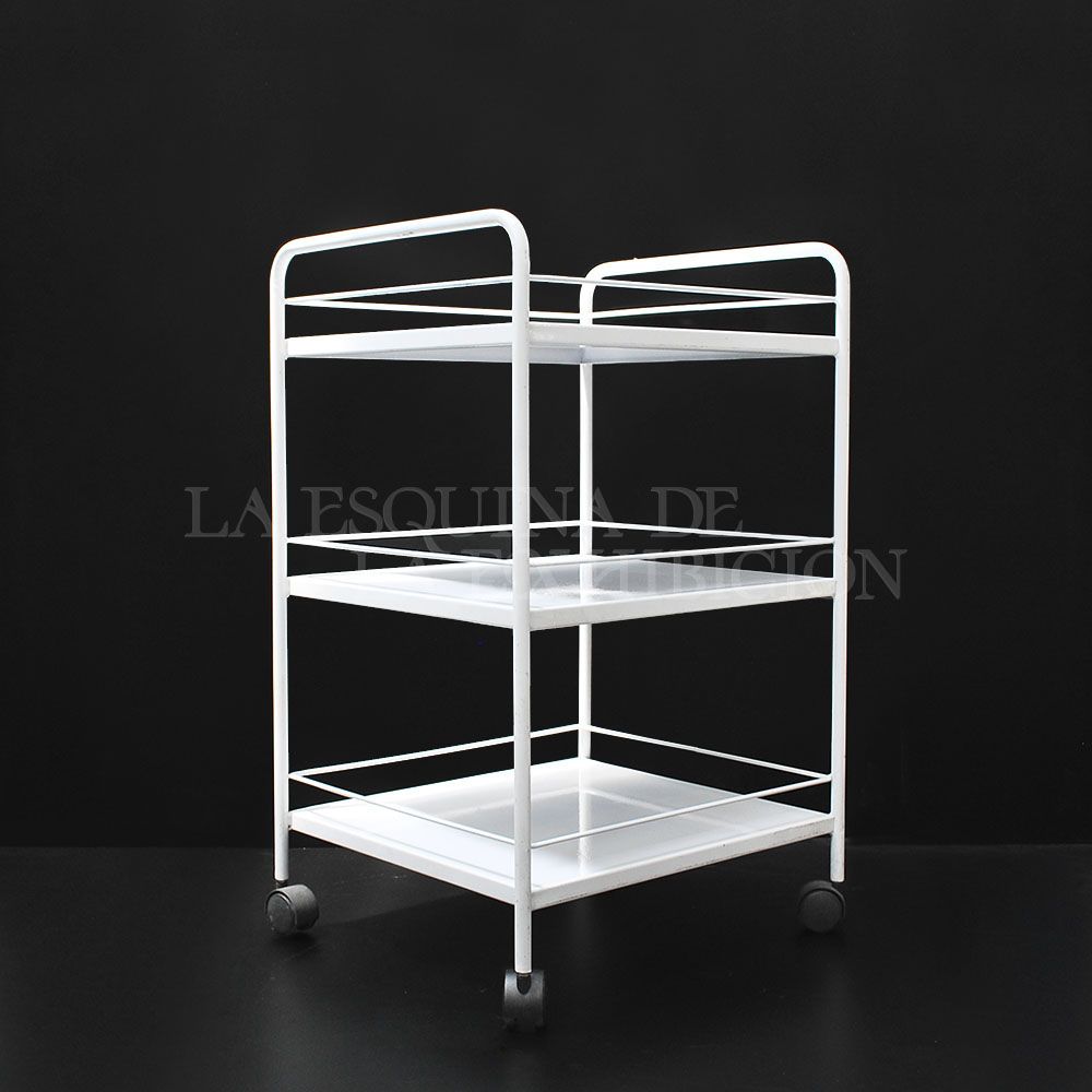 Mesa auxiliar con 3 entrepaños y rodachinas, color blanco.